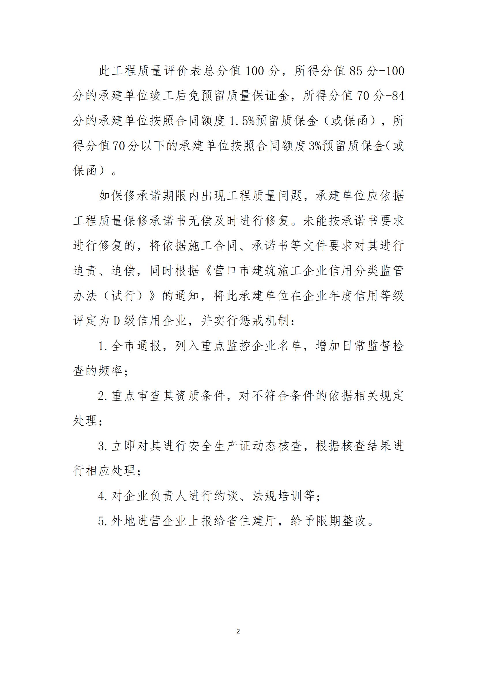 为确保工程项目质量的良好性和长期性,设立健全的工程质量罚则体系,在工程开工前由承建单位将工程质量承诺书和质量终身责任承诺书一并报送建设单位备案(详见附件2、3),工程在监督部门联合验收合格后,由承建单位递交竣工验收单,并根据合同约定的保修期限进行保修承诺。如承诺期限内出现工程质量问题,承建单位应依据工程质量保修承诺书无偿及时进行修复。未能按承诺书要求进行修复的,将依据施工合同、承诺书等文件要求对其进行追责、追偿,免于政府投资的损失,同时根据《中华人民共和国建筑法》、《建设工程质量管理条例》、《建筑市场信用管理暂行办法》、《辽宁省建设工程质量管理条例》等有关法律、法规,结合《营口市建筑施工企业信用分类监管办法(试行)》的通知,将此承建单位在企业年度信用等级评定为D级信用企业,并实行惩戒机制:
