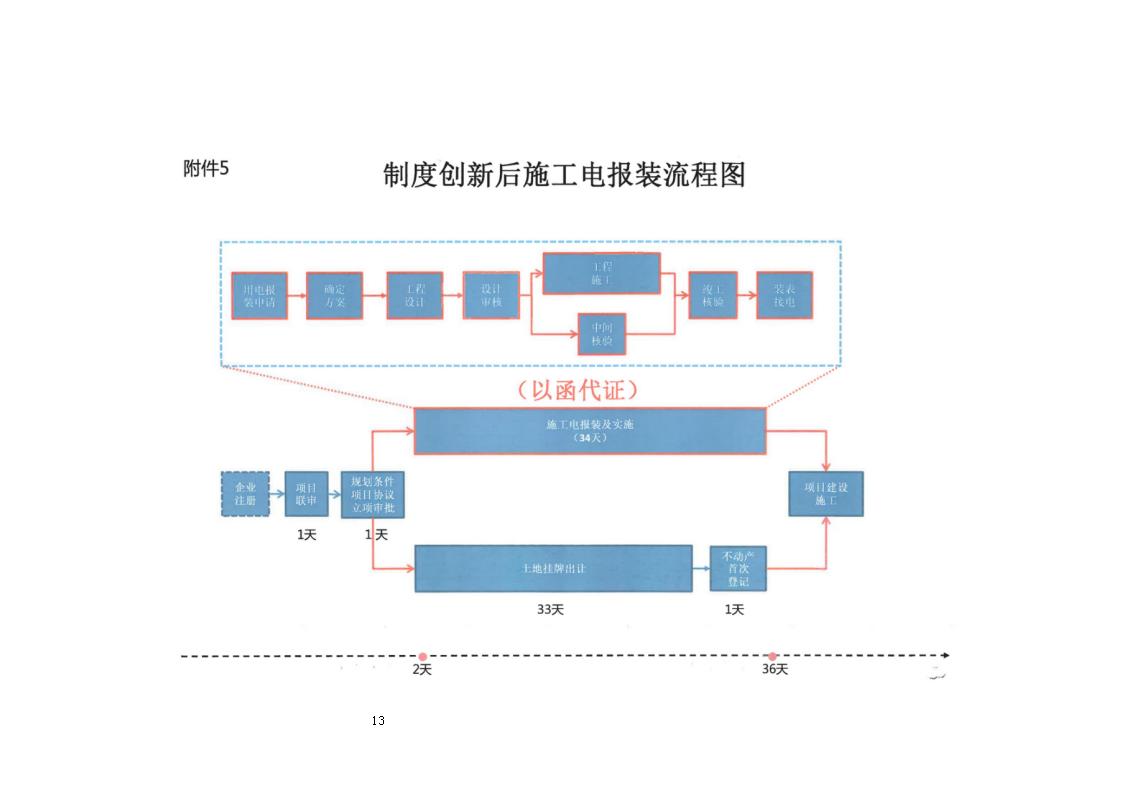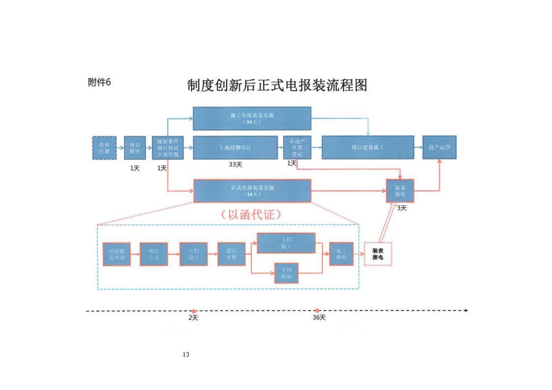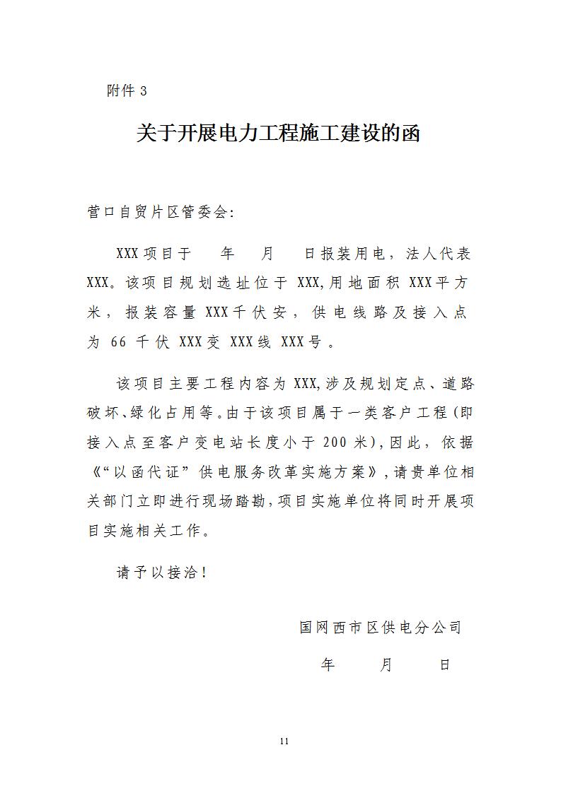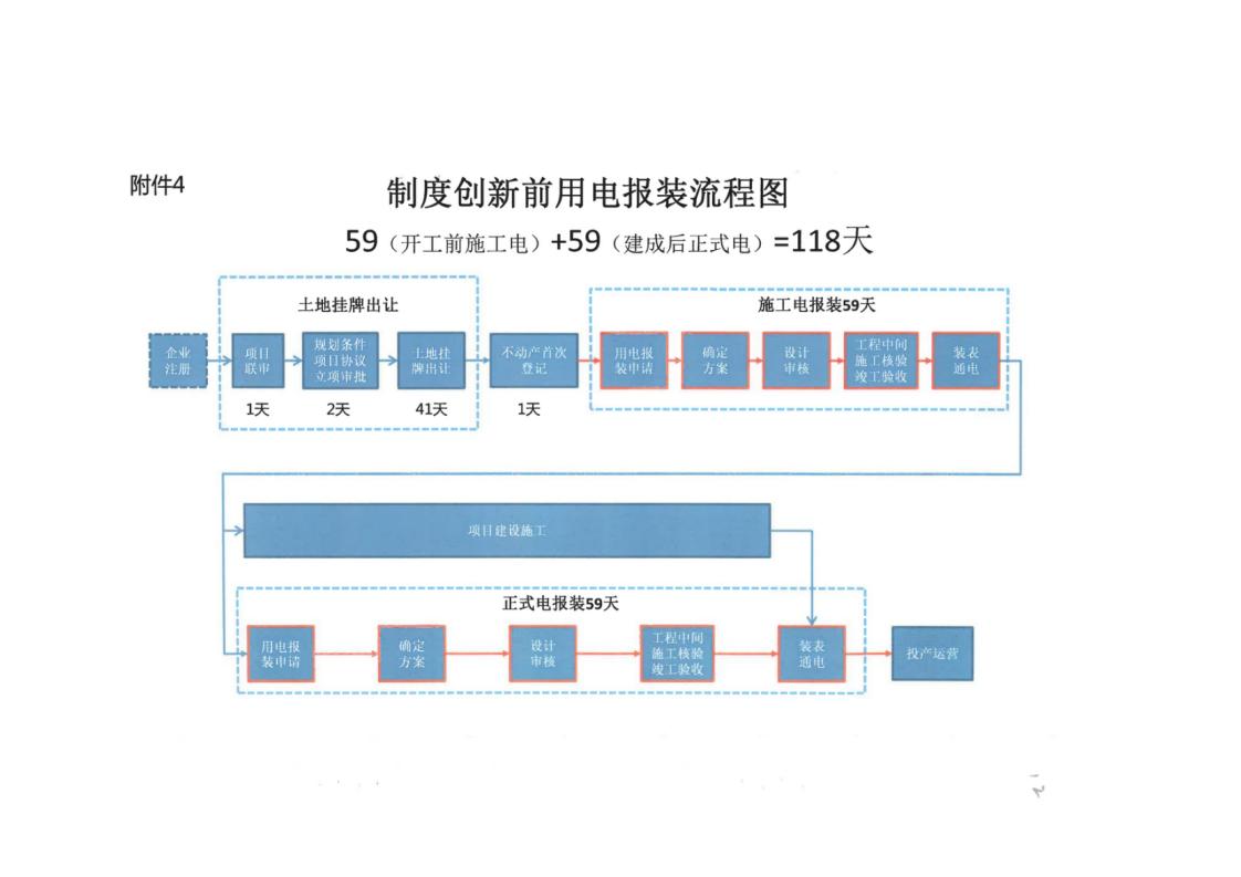 (1)项目用地红线外用电半径200 米及以下配套电力工程实施“备案制”,项目实施单位向营口片区报送“电力工程施工建设函”,会同营口片区相关部门立即进行现场踏勘,项目实施单位同时开展工程设计、预算、招投标、施工建设、送电等工作;