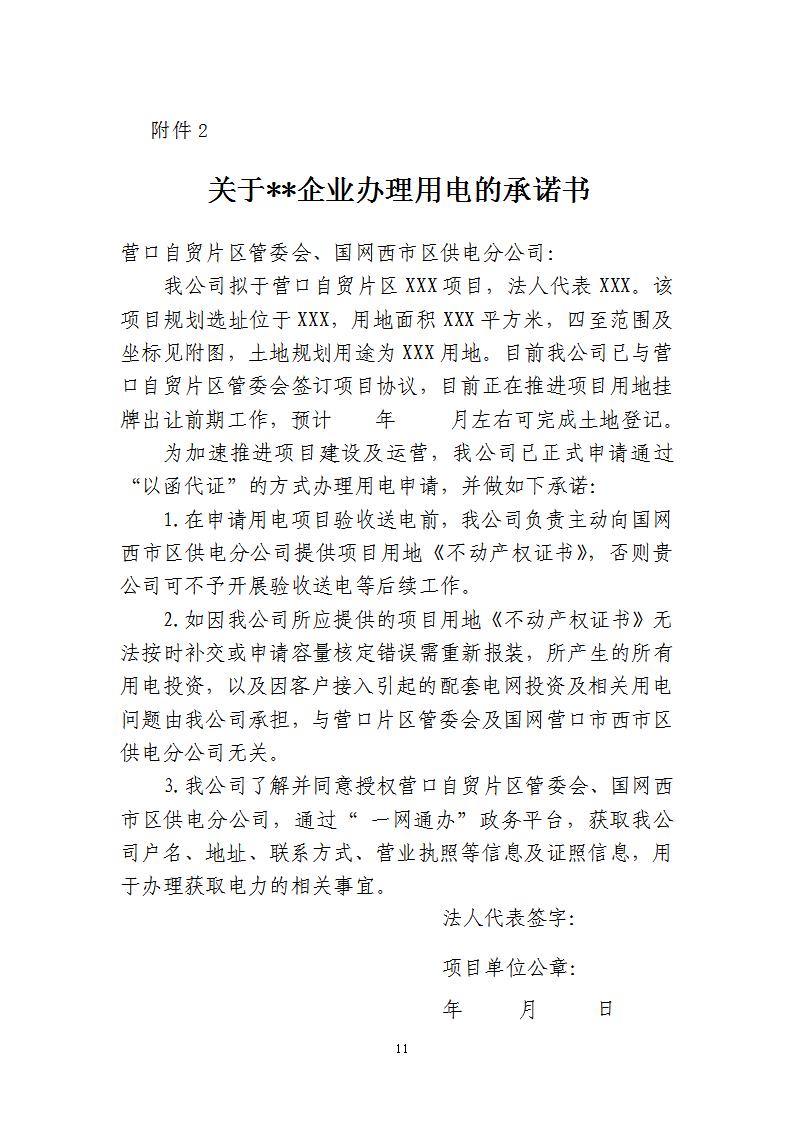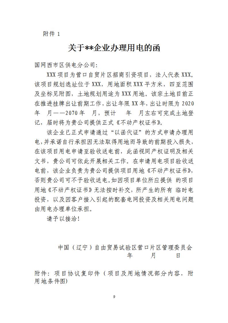 在企业未取得土地不动产权证书前,由营口片区管委会与用户达成共识,并出具“办电函”,附加项目协议、土地范围、土地登记完成时限、项目单位承诺函等内容,暂时代替土地不动产登记证书作为必要办电手续。